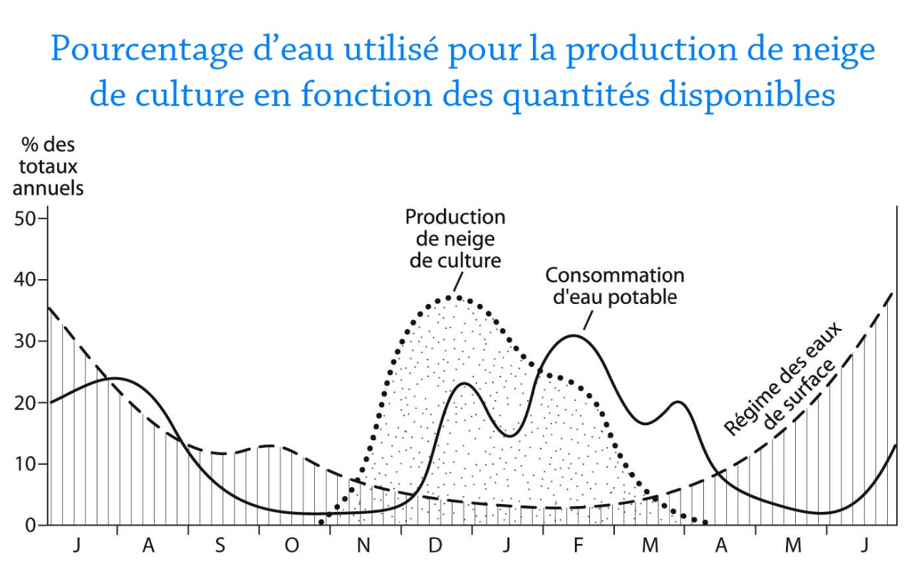 Voyons maintenant quelle quantité d'eau est utilisée pour la production de neige de culture à l'aide du graphique ci-dessous. On peut voir la quantité d'eau utilisée pour la production de neige de culture ainsi que sa répartition tout au long de l'année. On voit clairement qu'entre Novembre et Avril il y a des variations importantes au niveau de la consommation d'eau potable et du régime des eaux de surface. Tout cela est engendré à cause de la production de neige de culture, les stations se servent d'une partie de l'eau potable pour alimenter les canons à neige, ils prélèvent environ 30% de l'eau potable disponible pour produire de la neige. Ils prélèvent aussi de l'eau dans les rivières ce qui abaisse le niveau des eaux de surface.