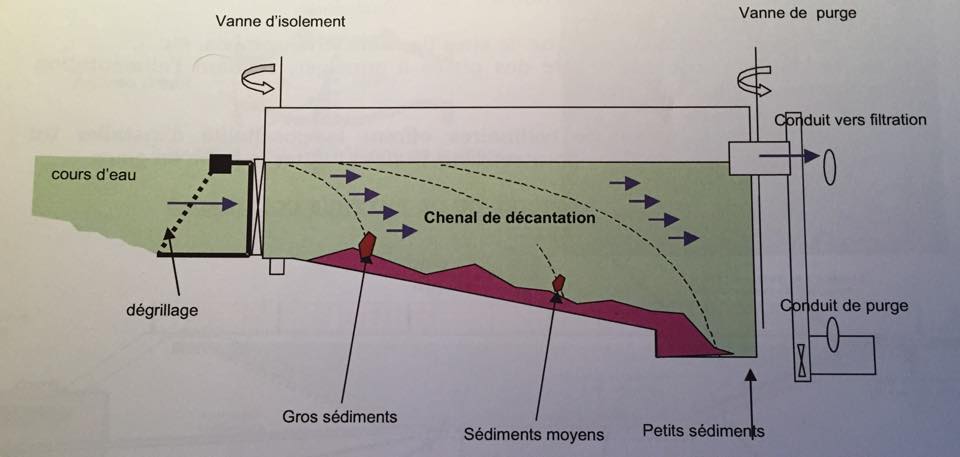 ❄ Décantation : elle est effectuée après dégrillage et consiste en un retrait des particules minérales de petite taille en suspension et qui troublent l'eau. La technique employée est le ralentissement de la vitesse de circulation dans un canal dont les dimensions sont déterminées par le débit et la quantité d'impuretés de l'eau à traiter. La vitesse de circulation ou vitesse de sedimentation doit être très faible pour permettre le dépôt de particules, ce qui peut engendrer à des ouvrages relativement conséquents.