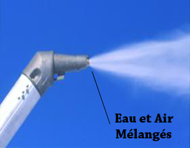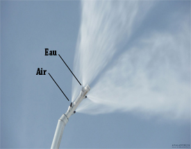 Cette étape consiste à atomiser le jet d'eau initial en projettant de l'eau sous pression dans l'air à travers un tout petit orifice qu'on appelle "buse d'atomisation" situé à l'extrémité du canon. La formation de microgouttelettes va alors débuter. Mais à cause du phénomène de surfusion que nous avons défini précédemment ici, l'eau ne va pas geler, même si la température à l'extérieur du canon est négative. Il va alors falloir former en parallèle les noyaux de de nucléation.